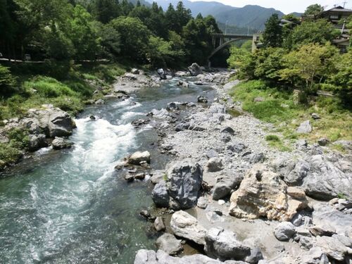 <橋を渡って細い階段を下ると、もう道は林の中で、下は渓流だ。大きな岩がごろごろと点在し、その間を川が流れる。ところどころ白波が立って、ほとんど玉堂の絵を見るようだ。思わず立ち止まって渓流を眺める。カメラを持っていたらつい両手で構えて、シャ…