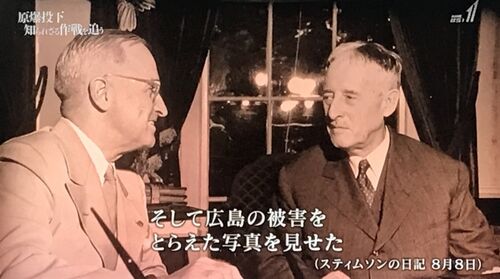原爆投下とトルーマンについて続ける。 広島への原爆投下2日後の8日、陸軍長官・スティムソンはトルーマンに原爆投下後の広島の写真を見せる。 広島、壊滅している。都市がなくなっている。 大統領・トルーマン、こう語る。 が、この半日後、長崎に2発目…