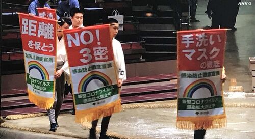 今日の土俵、このようなものが回った。 一瞬、見慣れない懸賞だなと思った。が、そうではなかった。 <手洗いマスクの徹底>,<NO! 3密>、<距離を保とう>、<感染しない させない>、あともう一本あった。東京都と相撲協会とのコラボらしい。今日か…